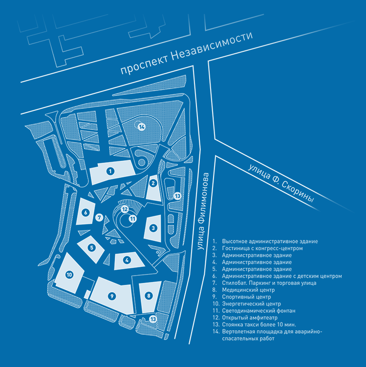 На земельном участке площадью в 8,27 га разместятся штаб-квартира Группы компаний Газпром в Республике Беларусь, административно-офисные здания, гостиничный комплекс с конгресс-центром, спортивный центр, детский учебно-развивающий центр, медицинский центр, торговая улица, амфитеатр, зона отдыха для горожан, надземный и подземный паркинги.