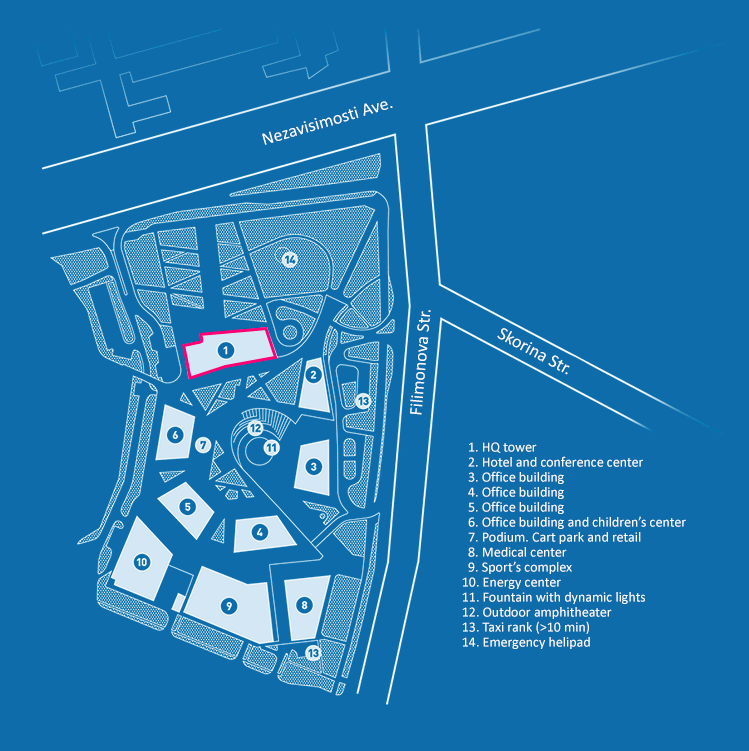 The complex is noted for its outstanding transport accessibility: the site is 2,6 km from the Minsk ring road and 5,8 km from the city centre (Oktyabrskaya square).