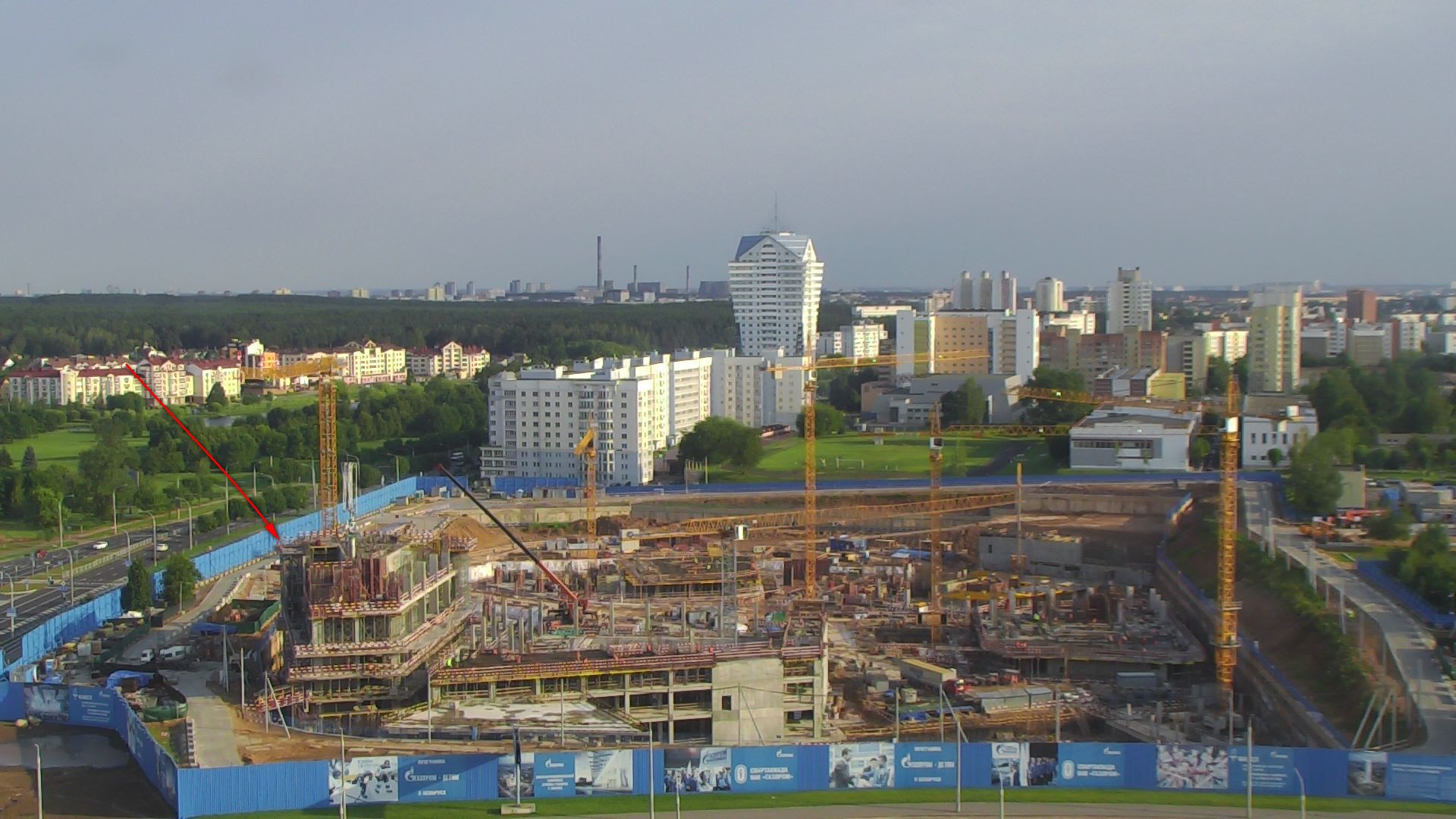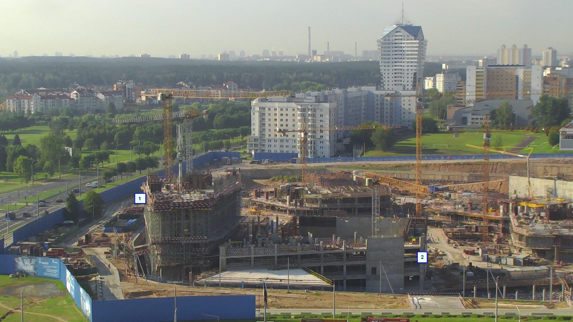 4 августа 2016 Основной период строительства Выполняются монолитные работы на 5 надземном этаже здания гостиницы (1), выполняются монолитные работы на первом надземном этаже здания конгресс-центра (2).